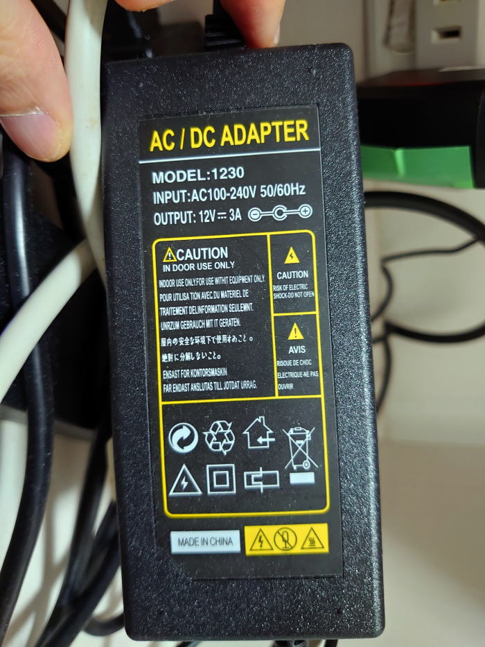 ACアダプタ。12V、3Aと記載がある。