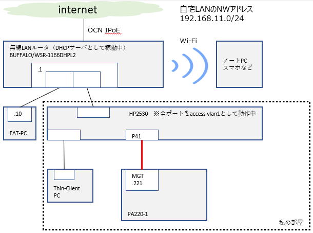 ではMGTポートにLANケーブルを接続し、電源を投入までしてみたいと思います。 ちなみに我が家のLAN構成はこんな感じです。 今回、下図の赤線のようにHP2530とPA-220(ホスト名はPA220-1にします)を接続し、FAT-PCからアクセスしてみます。 ![]() |