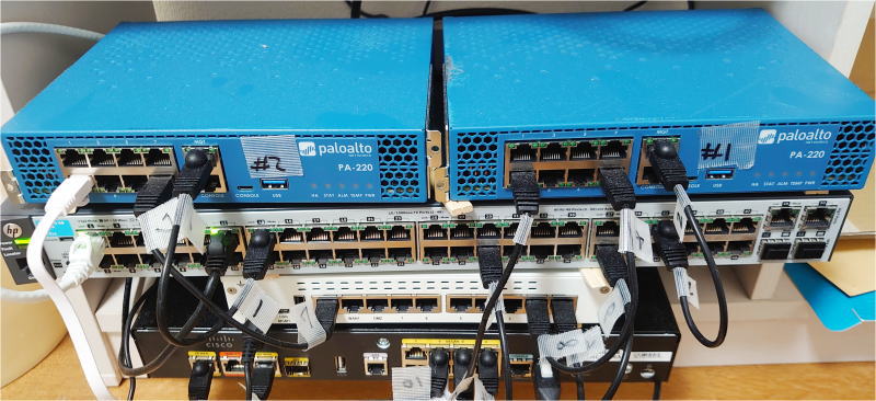 上のほうの青い2台が、今回学習するにあたり購入したPaloaltoのPA-220ってやつ。 その下は前から持っていたHP2530 Switch、Fortigate-60D、Cisco C891FJ-K9です。 これらはどれもファンレスで音がしないのがいいんだ。他にcatalyst3750とかもあるけど、音がうるさいのでいつもはクローゼットの奥で寝ている。 |
