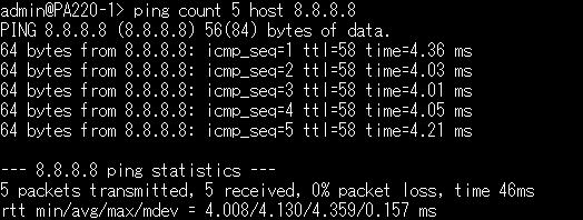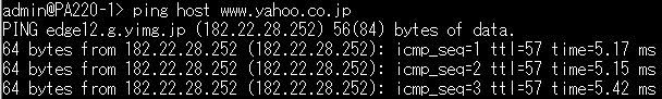 ありがとう。今回、PA-220が正引き時に参照するDNSサーバを8.8.8.8に指定していた。なので8.8.8.8にPingが飛ぶってことは正引きもできるはずなので、試しにyahooにPingを打ってみてほしい。 ping host www.yahoo.co.jp |
