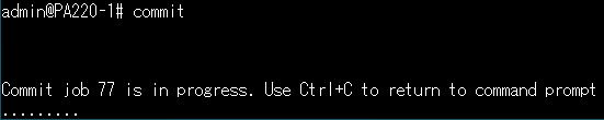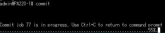 Ciscoの場合、投入したコンフィグが即座にrunning-configに反映されるけど、Paloaltoの場合は反映されないんだ。投入したコンフィグはcandidate-config(候補コンフィグ)に書き込まれて、一旦保留したような状態になる。そしてcandidate-configをrunning-configに反映させるためには、CLIでcommitと打つか、GUIで画面右上のほうにある「commit」ボタンを押す必要がある。commitは時間もけっこうかかる。機種や更新するコンフィグ量によっても変わってくるけど、早くても3分以上かかるのが普通という印象かな。 |