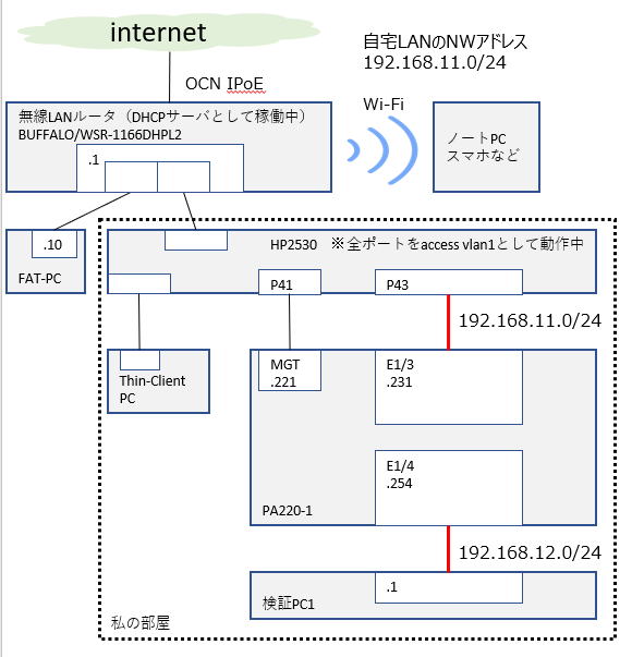 前回でMGTポートの設定まで完了したので、今回はMGTポート以外の設定に進みたいと思う。 具体的には下図の通り、赤線部分を接続し、PA220-1のE1/3とE1/4ポートにIPアドレスなどを設定し、検証PC1からインターネットなどにアクセスできるところまで実施したいと思う。 ![]() |