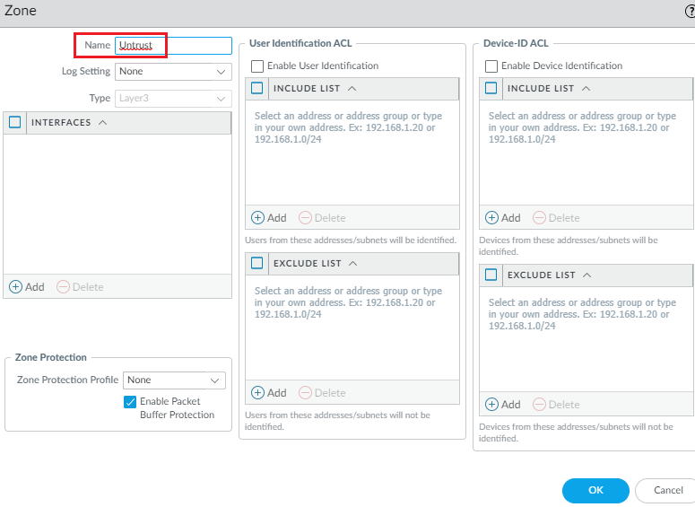 ③Nameに任意の名前をつけます。今回は「Untrust」にしました。右下のOKを押します。