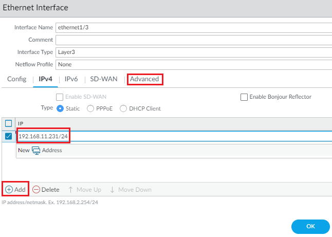 ⑤「Add」を押し、インターフェースに割り当てるIP(今回は192.168.11.231/24)を入力後、「Advanced」を押します。