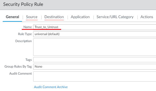③Generalタブが開きます。Name欄に任意の名前(今回は "Trust_to_Untrust" にしました)を入力します。