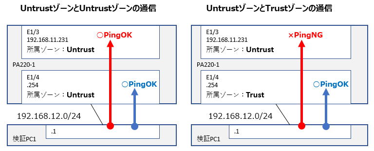 なるほど。さっきの赤矢印のPingは、TrustゾーンとUntrustゾーン間の通信だったから、弾かれてしまっていたということか。 ということは、仮にE1/4の所属ゾーンもUntrustだったら、赤矢印の通信はUntrustゾーンとUntrustゾーン間の通信になるから、PingOKになるってことかな? |
