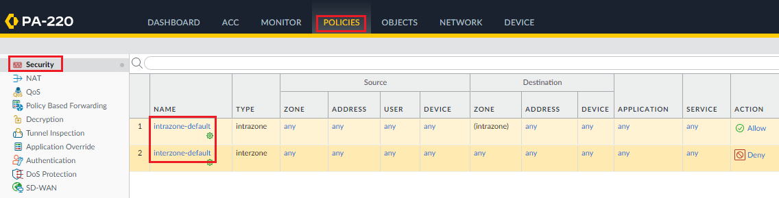 NAMEが「intrazone-default」と「interzone-default」の2つのポリシーが予め作成されています。