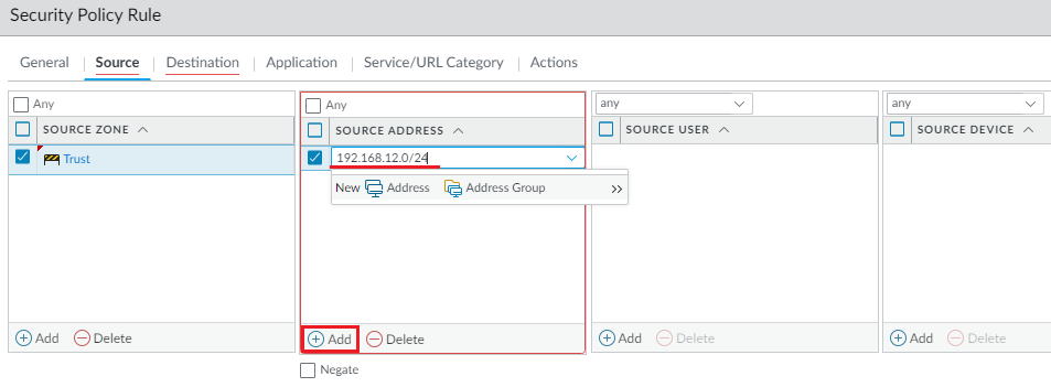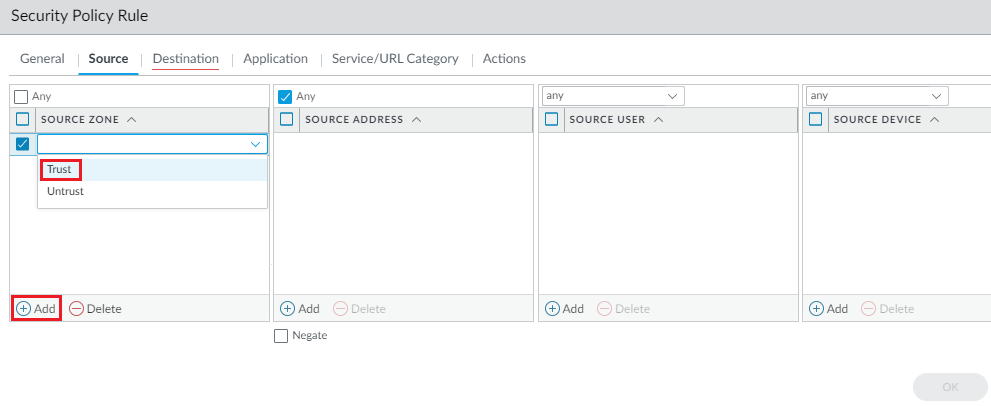 今回の要件は「送信元ゾーン:Trust」でしたので、「Add」→「Trust」の順にクリックします。