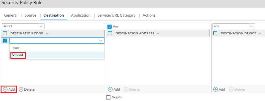 今回の要件は「宛先ゾーン:Untrust」でしたので、「Add」を押し「Untrust」を選択します。