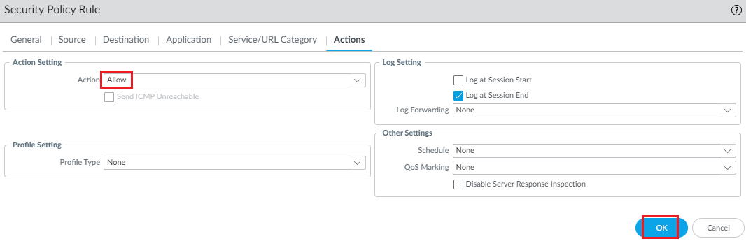 ⑨Actionタブを開きます。下図の通りデフォルトで「Allow」になっています。今回はこのままでOKです。