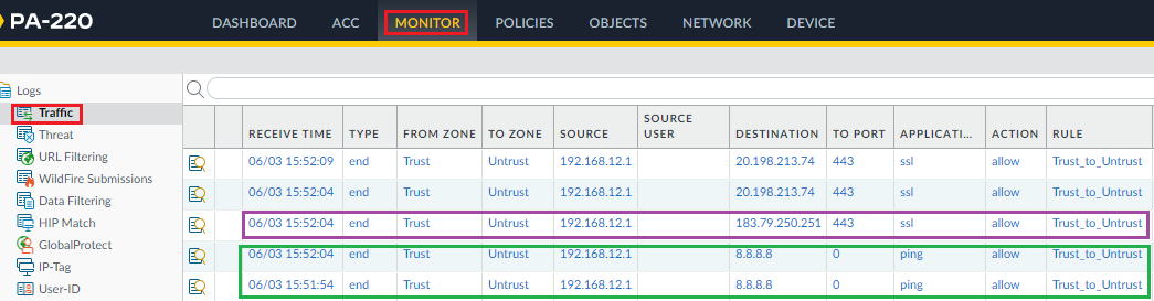 ありがとう。なお、下図のようにGUI画面で「MONITOR」→「Traffic」と進むと、トラフィックログを確認することができる。紫枠がyahooにWEBアクセスしたときのもの。緑枠が8.8.8.8にPingを打った時のものだね。 |